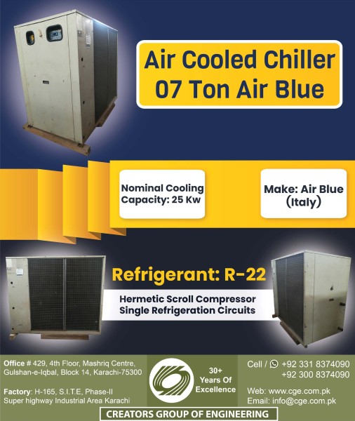 Nominal Cooling Capacity: 25 Kw Make: Air Blue (Italy) Hermetic Scroll Compressor Single Refrigeration Circuits Refrigerant: R-22 Grooved Copper Tubes, Aluminum Fins Condensers Axial Flying Bird Fans with Rotating Shroud Direct-Expansion Welded Plate Heat Exchanger Evaporator Nominal Power Supply: 380~440V 3Ph 50Hz