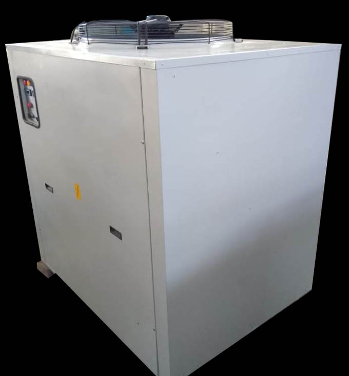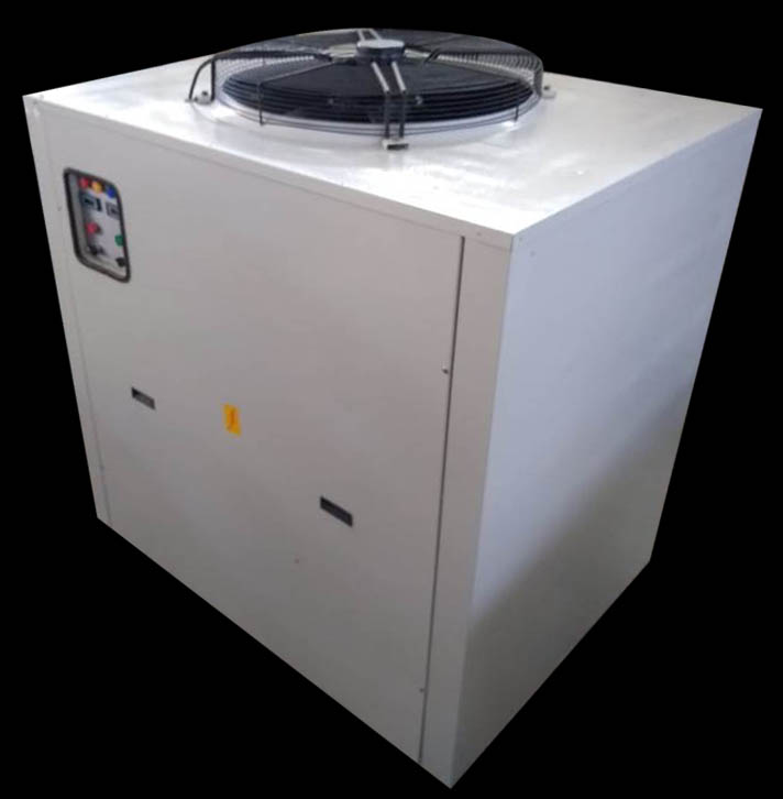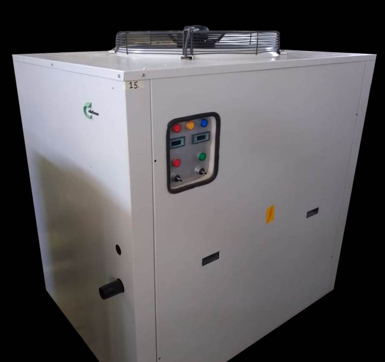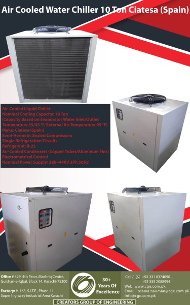 Air Cooled Water Chiller 10 Ton Ciatesa (Spain) Air-Cooled Liquid Chiller Nominal Cooling Capacity: 10 Ton (Capacity Based on Evaporator Water Inlet/Outlet Temperature 55/45 °F, External Air Temperature 95 °F) Make: Ciatesa (Spain) Semi-Hermetic Sealed Compressors Single Refrigeration Circuits Refrigerant: R-22 Air-Cooled Condensers (Copper Tubes/Aluminum Fins) Electrometrical Control Nominal Power Supply: 380~440V 3Ph 50Hz