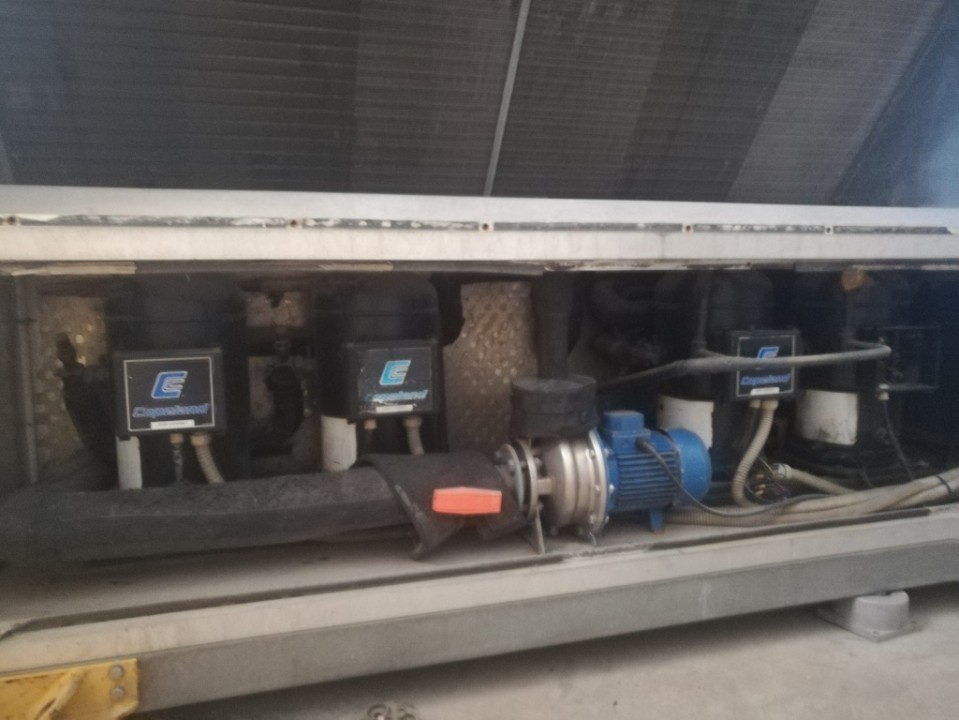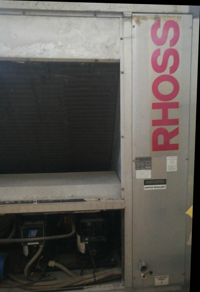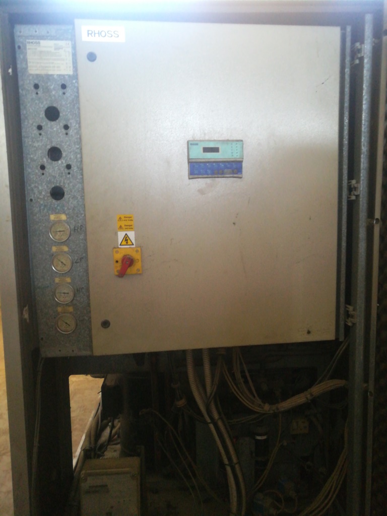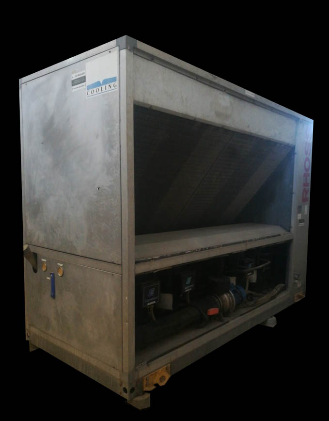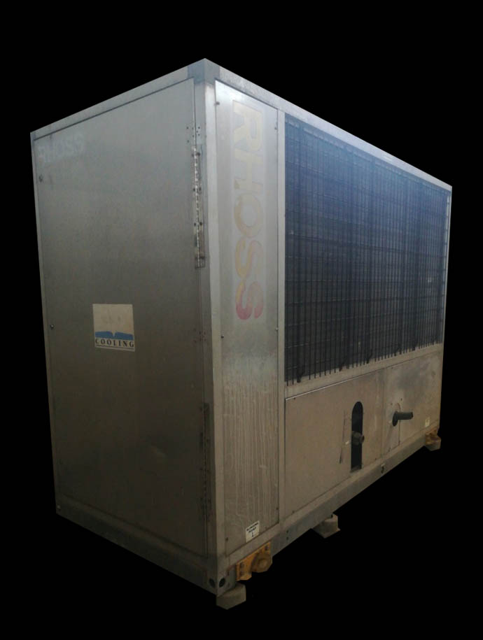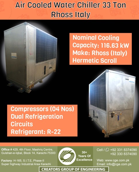 Air Cooled Water Chiller 33 Ton Rhoss Italy Air-Cooled Liquid Chiller Nominal Cooling Capacity: 116.63 kW (Capacity Based on Evaporator Water Inlet/Outlet Temperature 55/45 °F, External Air Temperature 95 °F) Make: Rhoss (Italy) Hermetic Scroll Compressors (04 Nos) Dual Refrigeration Circuits Refrigerant: R-22 Air-Cooled Condensers (Copper Tubes/Aluminum Fins) High and Low Refrigerant Pressure Switches Refrigerant Pressure Gauges Parametric Microprocessor Control Phase Monitor against Phase Loss and Phase Reversal Compressor Crankcase Heater Nominal Power Supply: 380~440V 3Ph 50Hz