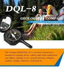 High Quality Brunton Geological Magnetic Mining Compass Model DQL-8 Made of Aluminum Alloy Crust Material Main Features This lightweight and durable transit was designed for the specific tasks required of geologists, surveyors, mining engineers, civil engineers, environmental engineers and foresters. The direct-read compass capsule of this transit features 1 degree resolution and 1/2 degree accuracy. And the dry compass capsule of this quick dampening needle features both a needle-lock to protect the compass assembly during transit and gear driven adjustable declination to allow for simple compensated bearings. Lightweight, only 240g, compact small and easy to carry Features include a compass bubble level, clinometer level, sighting mirror with lubber line and sighting hole, induction dampened needle, and adjustable sighting points. The vertical angle clinometer scale featuring 1 degree increments has a range of 90 degrees or 100% grade scale with an accuracy of 1/2 degree. A percent grade scale features increments of 5%. Specification Damping Time of Needle: < 15s Graduation Circle: 0 ° - 360 ° Dial Scale: 1 ° Precision of Long Air Level: 20' ± 5' /2mm Precision of Circle Air Level : 30' ± 5' /2mm Reading Error : ≤ 0.5 °