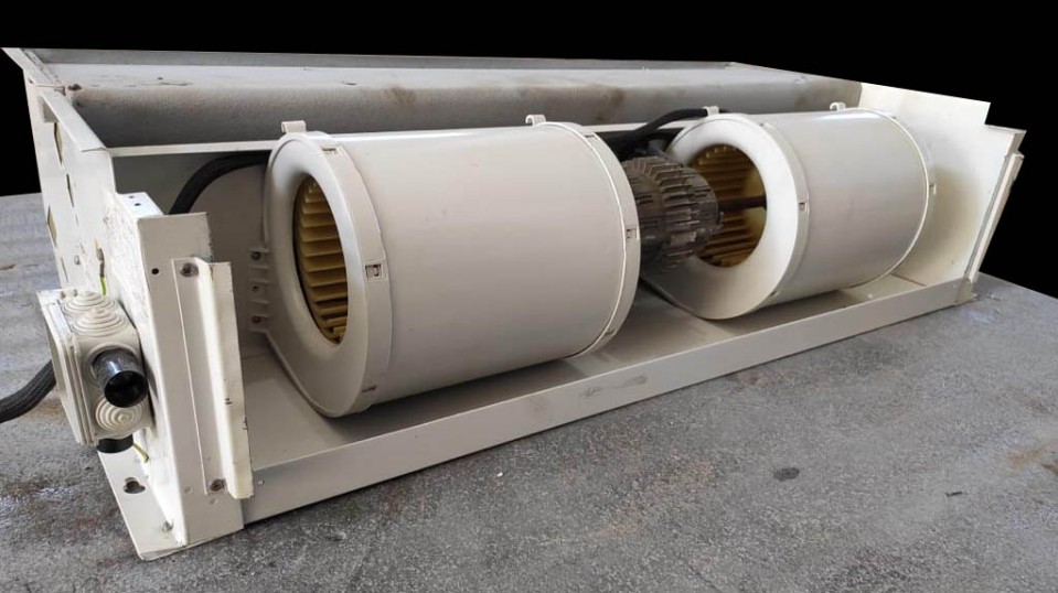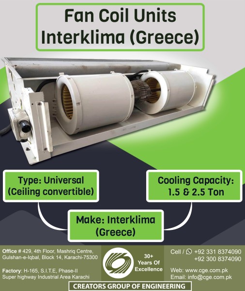 Chilled Water Fan Coil Units Make Interklima Greece Slim line Design Air foil shaped, Fan wheel made of special high resistance plastic for high air flow with low fan speed. Completely noiseless operation. Make: Interklima (Greece) Cooling Capacity: 1.5 & 2.5 Ton Nominal Air Flow: 400 & 800 CFM Type: Ceiling Concealed Media: Water Cooled Static Pressure: Low Static Blower: Centrifugal Type (Hot Dip Galvanized Body) Induction Motor: Direct Driven Motor (Three Speed) Power Supply: 220~230V 1Ph 50Hz Fabricated with a Rigid Galvanized Steel Casing and SS Drain Tray Fan motor built-in with thermal cut-out to prevent overloading at any speed and duty of the fans.