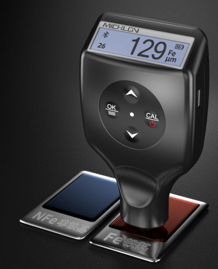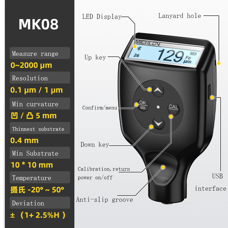"MICHLON" (China) Paint Coating Thickness Gauge (DFT Meter) Model MK-08 Measuring Range : 0-2000µm (0-2mm) or 0-80mil Accuracy : ±1-2% (±2.5µm or 0.1mil - whichever the greater) Memory: 6000 Data Storage (100 groups, 60 dates per group) Unit: Metric/Imperial Switchable (mil/um selectable) Back light: Brightness adjustable clear & easy reading Alarm: Set higher & lower alarm range for measuring Calibration: Zero Calibration, 1 Point Calibration, 5 Point Calibration selectable Data Transfer: USB, Bluetooth APP: Windows, Android App, iOS App Delete Data: delete a single data or clear all the data Probe Select: Automatically detects ferrous and non ferrous substrates Power supply : 2 x 1.5V AAA Batteries Minimum Sample Thickness : 0.3mm Resolution : 0.1µm (0-99.9 µm) and 1µm (over 100 µm) Application : measuring coating thickness Certification : CE, RoHS Minimum Measurement Area : 4mm Operating Conditions : Temp: -10 - 50ºC and Humidity: < 85% ACCESSORIES INCLUDED 1. No Plastic Test Shims (50,100,250,500,um) 1.No. Calibration Plate Steel 1.No. Calibration Plate Aluminum 1.No. Manual Operation 1.No. Calibration Certificate 1.No. Warranty Card 1.No. Carrying Case (Plastic)