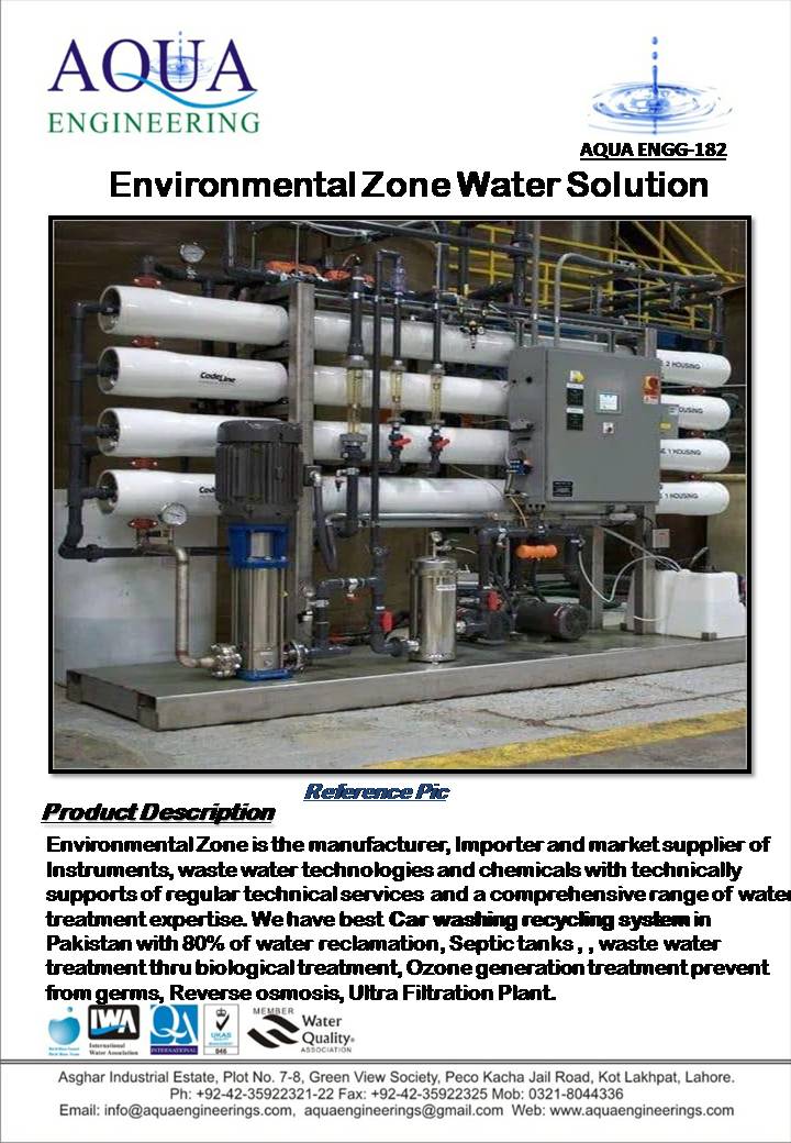 Environmental Zone is the manufacturer, Importer and market supplier of Instruments, waste water technologies and chemicals with technically supports of regular technical services and a comprehensive range of water treatment expertise. We have best Car washing recycling system in Pakistan with 80% of water reclamation, Septic Tanks techniques/Designing, waste water treatment thru biological treatment, Ozone generation treatment prevent from germs, Reverse osmosis, Ultra Filtration Plants, Distilled and De-ionizing Plants, Softeners.