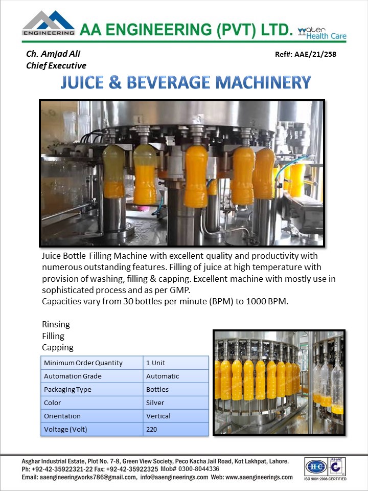 numerous outstanding features. Filling of juice at high temperature with provision of washing, filling & capping. Excellent machine with mostly use in sophisticated process and as per GMP. Capacities vary from 30 bottles per minute (BPM) to 1000 BPM.
