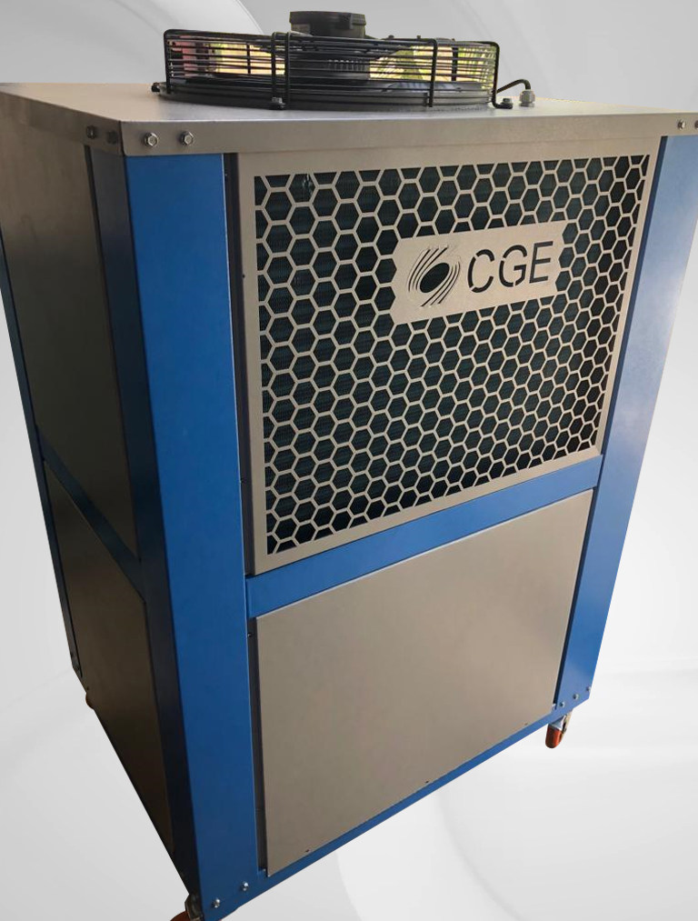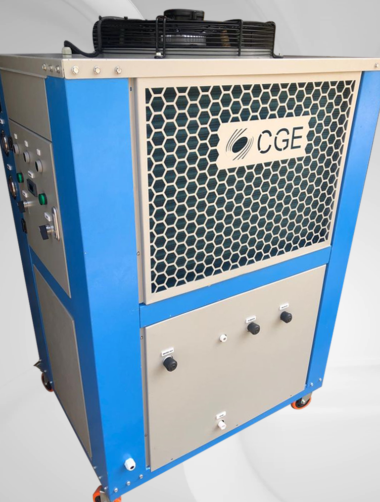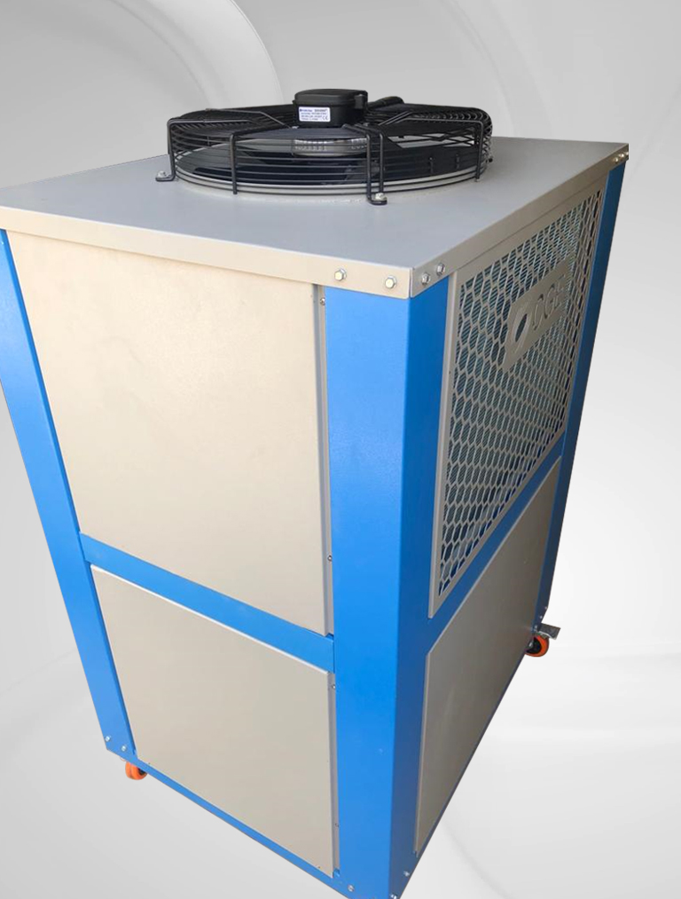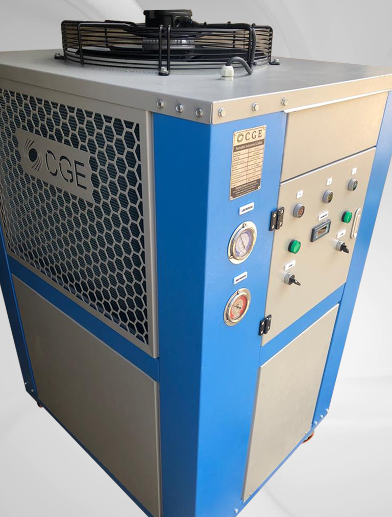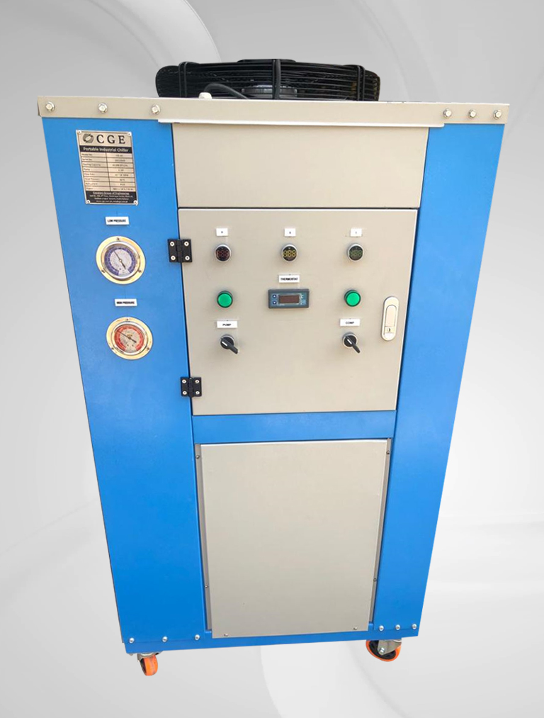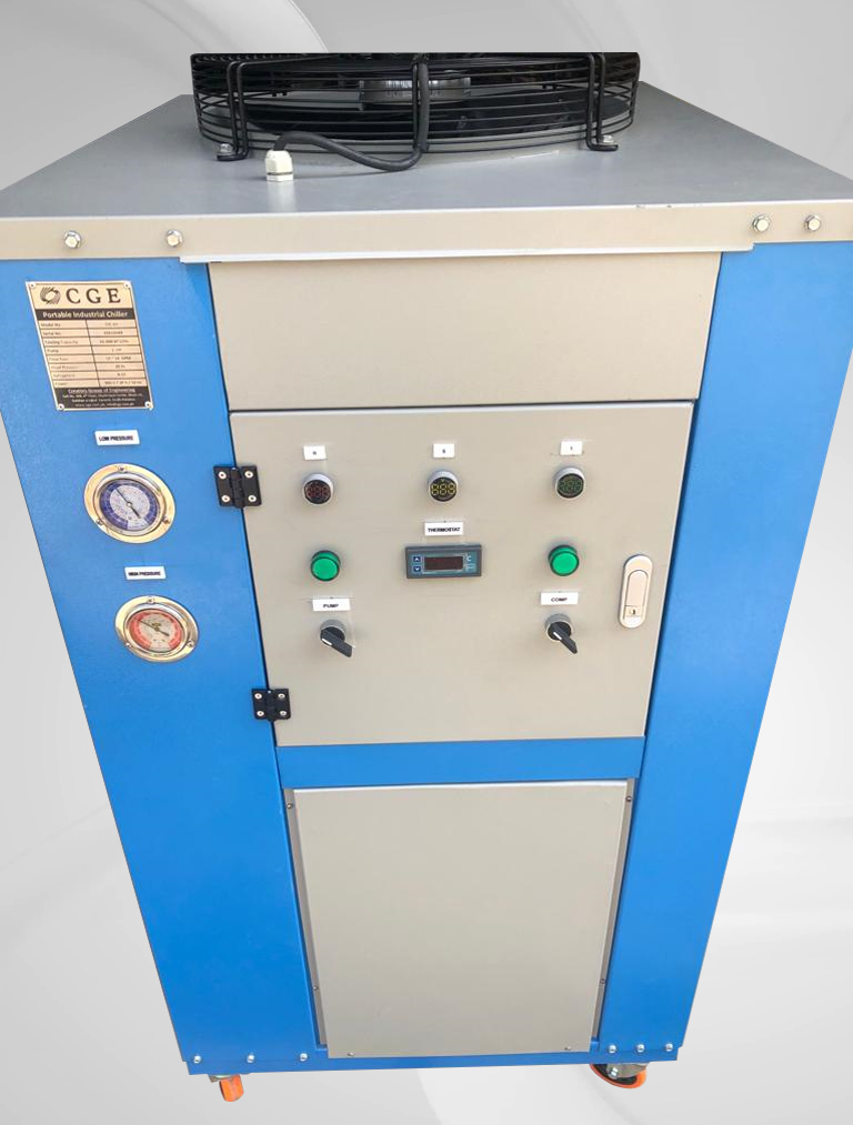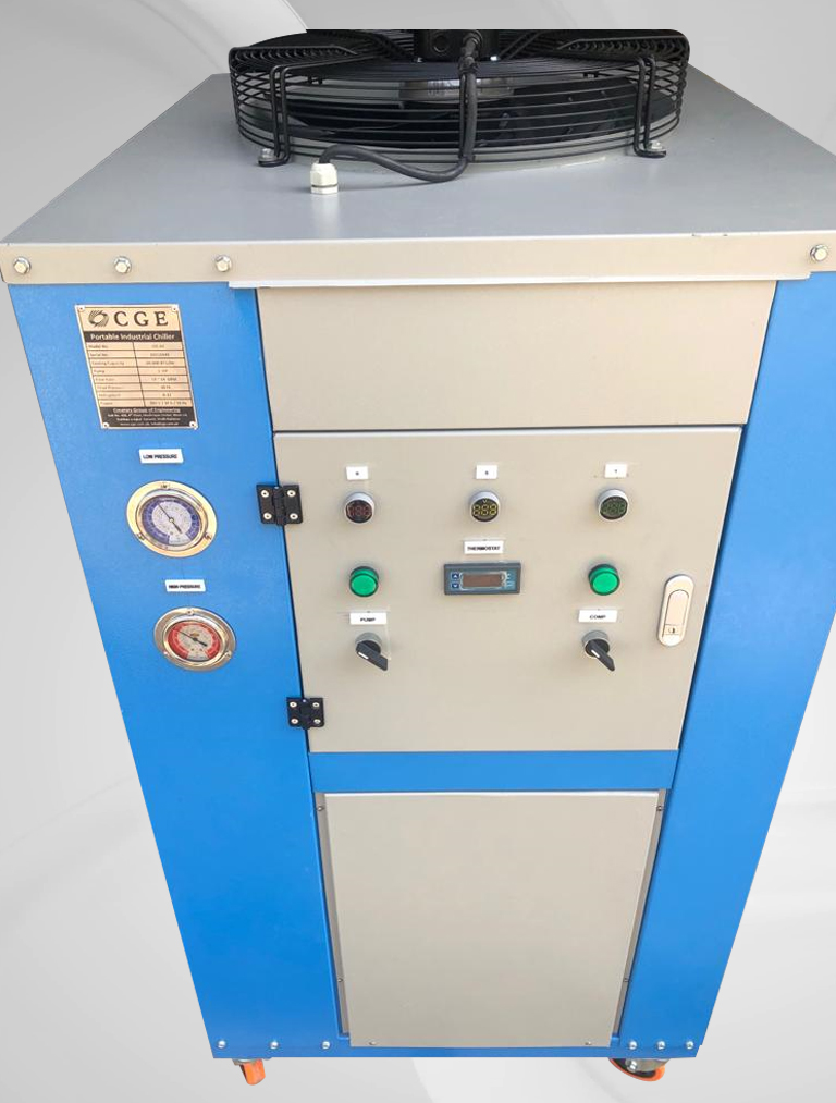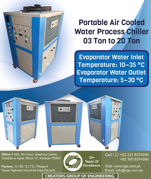 Portable Air Cooled Water Process Chiller Capacity Range: 03 Ton ~ 20 Ton Built-in SS Tank Volume Built-in Water Circulation Pump Grooved Copper Tubes, Aluminium Fins Condensers Water Dip Copper Tube Evaporator Evaporator Water Inlet Temperature: 10~35 °C Evaporator Water Outlet Temperature: 5~30 °C Chiller Body: Galvanized Sheet Powder Coated Oven Baked