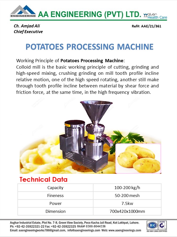 Working Principle of Potatoes Processing Machine: Colloid mill is the basic working principle of cutting, grinding and high-speed mixing, crushing grinding on mill tooth profile incline relative motion, one of the high speed rotating, another still make through tooth profile incline between material by shear force and friction force, at the same time, in the high frequency vibration