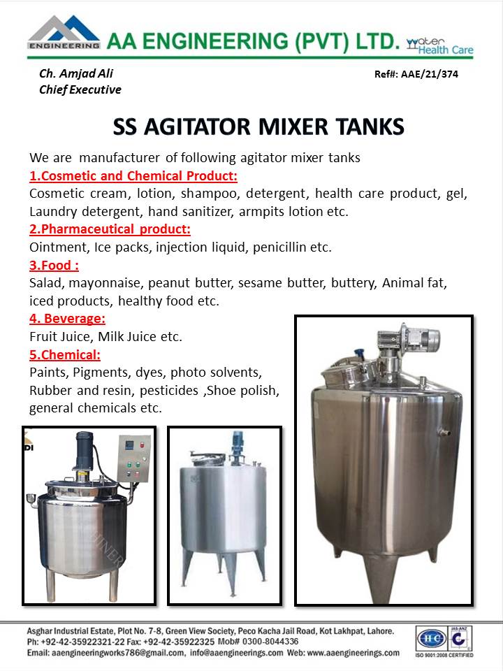 We are manufacturer of following agitator mixer tanks 1.Cosmetic and Chemical Product: Cosmetic cream, lotion, shampoo, detergent, health care product, gel, Laundry detergent, hand sanitizer, armpits lotion etc. 2.Pharmaceutical product: Ointment, Ice packs, injection liquid, penicillin etc. 3.Food : Salad, mayonnaise, peanut butter, sesame butter, buttery, Animal fat, iced products, healthy food etc. 4. Beverage: Fruit Juice, Milk Juice etc. 5.Chemical: Paints, Pigments, dyes, photo solvents, Rubber and resin, pesticides ,Shoe polish, general chemicals etc.
