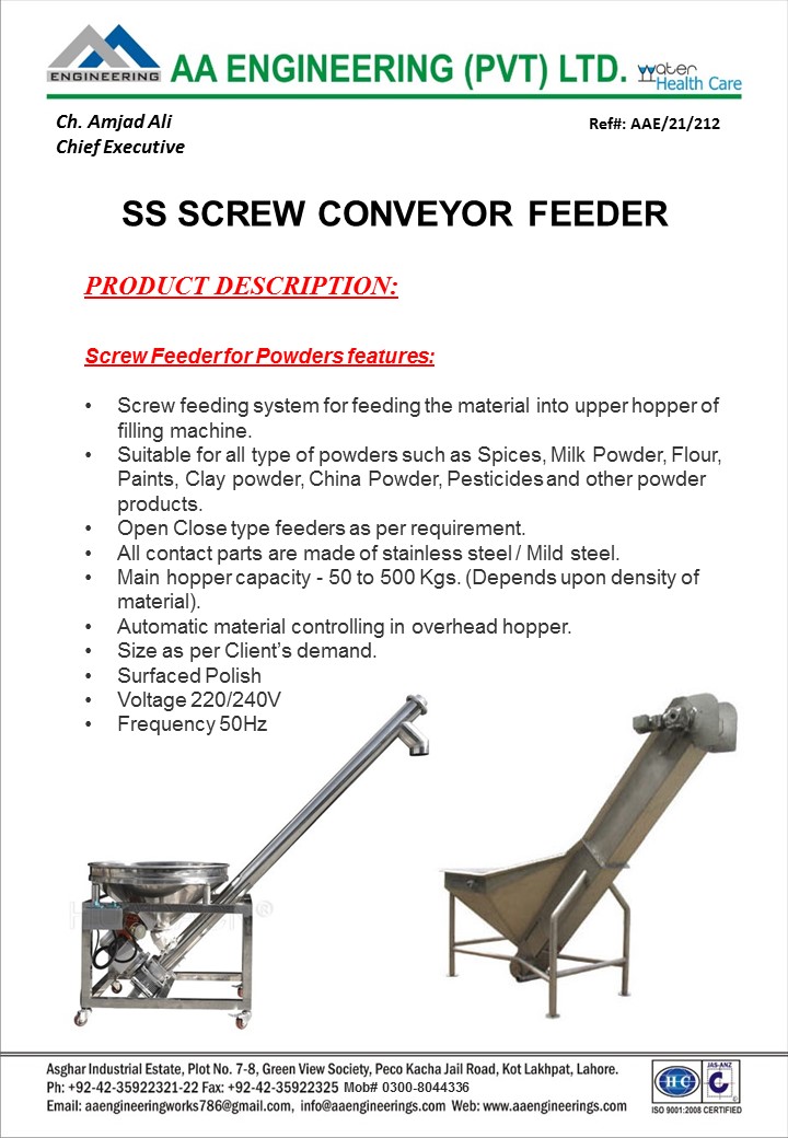 Screw feeding system for feeding the material into upper hopper of filling machine. Suitable for all type of powders such as Spices, Milk Powder, Flour, Paints, Clay powder, China Powder, Pesticides and other powder products. Open Close type feeders as per requirement. All contact parts are made of stainless steel / Mild steel. Main hopper capacity - 50 to 500 Kgs. (Depends upon density of material). Automatic material controlling in overhead hopper. Size as per Client’s demand. Surfaced Polish Voltage 220/240V Frequency 50Hz