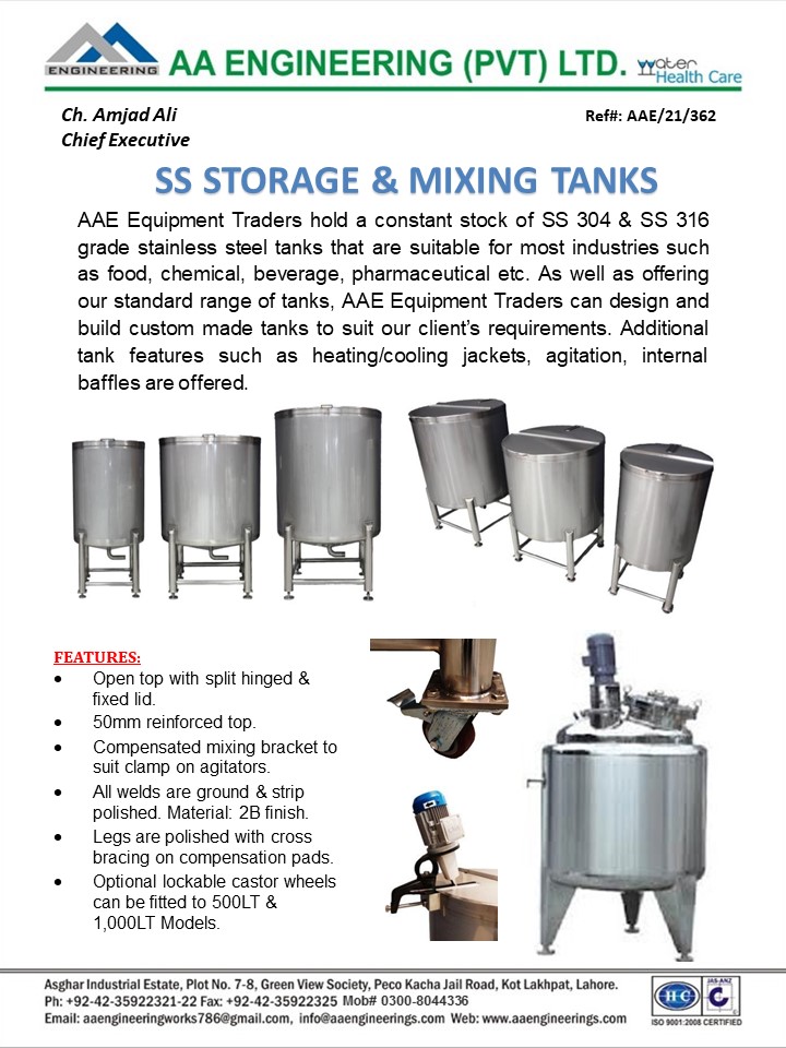 AAE Equipment Traders hold a constant stock of SS 304 & SS 316 grade stainless steel tanks that are suitable for most industries such as food, chemical, beverage, pharmaceutical etc. As well as offering our standard range of tanks, AAE Equipment Traders can design and build custom made tanks to suit our client’s requirements. Additional tank features such as heating/cooling jackets, agitation, internal baffles are offered.