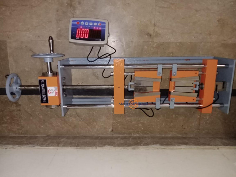Technical Details The load application mechanism includes a hand-driven worm and wheel gearbox, driving a lead screw with approximately 400 mm of travel. The mechanism uses ball races and self-aligning ball thrust races in the direction of loading. These low friction bearings, with the large handwheel, allow the user to apply maximum load with minimum effort. They also give smooth and progressive operation, necessary to help the user apply a steady strain rate for best results. The unit also has a smaller “quick advance” handwheel that allows the user to set the distance between the chucks simply and quickly before each test. The load measuring mechanism is a strain-gauged load cell that connects to a microprocessor-controlled digital display